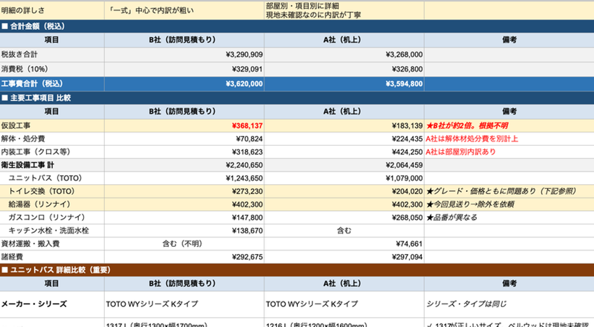 妹の中古マンション購入シリーズです。※リフォーム編はとても長くなってしまったので、前編・後編の2部構成にしました。今回は前編として、業者選定の経緯をお届けします。(かなりの超大作なので、興味の方は読んでいただけると嬉しいです)妹が中古マンションを購入したのをきっかけに、『川越で築浅×駅近は幻?妹の中古マンション購入記』今回は、妹の中古マンション購入について書いてみたいと思います。私はフロリダに住んでいるため、日本の妹からの報告をもとにした遠隔見守り記録です(笑)。結果的…ameblo.jp姉の私がフロリダからリフォームのサポートをすることになりました。「ちょっと手伝うくらいでいいかな〜」と軽く考えていたのですが……気づけばChatGPT・Google AI・Claudeの3つのAIと一緒に見積書を精査し、比較スプレッドシートを作り、業者への確認メールの文案まで一緒に考える羽目に(笑)今回はその記録を時系列でお伝えします。物件概要 場所:埼玉県川越市 間取り:2LDK(約55㎡) 築年数:13年・6階 鍵の引渡し:6月上旬予定リフォーム計画のスタート入居前にまとめてリフォームをする前提でスタート。実はこのマンション、もともとタカラスタンダードのハイグレードな設備が入っていました。そこで妹側の仲介不動産の担当者から、「変えすぎるとマンション自体の価値が下がる可能性がある」とアドバイスをもらったそうです。それを受けて洗面台本体は見送ることに。クリーニングで十分キレイになるし、良いものをわざわざ替えるのはもったいない、という判断です。ただ水栓だけは13年経過しているので交換することに。ただ、かなり綺麗好きな妹にとって、ユニットバスだけは別の話でした。前のオーナーがあまり掃除をしていなかったようでカビが多く、ここだけはどうしても全取替えしたいというのが妹の強い希望。これは譲れないポイントとして最初から言っていました。トイレも手洗い部分の汚れが気になって丸ごと交換したいと。キッチンは、ガステーブルと水栓の交換も。ガスコンロは使えないほどではなかったものの、油汚れがかなり残っていてクリーニングで落とせるか不明だったこともあり、こちらも交換することになりました。それと、クロスですが、あまり汚れてはいないものの、新築感を出したく、ぜひ変えたいと、これも妹たっての希望で前面張替えに。当初の検討内容はこちらです。 ユニットバス交換 トイレ交換 キッチン(コンロ交換・水栓交換) クロス全面張替え 洗面台(水栓のみ交換)給湯器は今回見送りに実はリビングに床暖房があるため、このマンションには「ガスふろ給湯暖房用熱源機」という床暖房対応の特殊な熱源機が設置されています。温水を床暖房のパイプに循環させる機能を持つ大型の機器で、交換費用は約40万円。給湯器の寿命は一般的に10〜15年と言われていて、築13年のこのマンションはちょうどその目安に差し掛かっている時期です。ただ、まだ問題なく動いているし、給湯器は室外に設置されているため交換時に室内の養生工事が不要で、内装リフォームのタイミングに合わせて一緒にやる必要もありません。約40万円という金額も大きく、予算を300万円以内に抑えたいという事情もあり、今回は見送って、壊れそうなサインが出たら交換という判断になりました。業者Aの机上見積、そして相見積もりへまずは仲介不動産会社経由で、業者Aの机上見積を取得しました。価格が比較的リーズナブルで、クロスはサンゲツSPの量産グレードで約1,300円/㎡とかなり魅力的でした。ただ「机上見積」なので現地を見ていない分、あくまで参考値という位置づけ。実際の金額がどう変わるかは不透明でした。このタイミングで仲介不動産の担当者から思わぬアドバイスが。「うちは高いので、外部でも相見積もりした方がいいですよ」とのこと。さっそく自分たちで探して、いくつか問い合わせてみましたが、納期が間に合わないなどの理由で、2社にまさかの辞退されてしまいます。リフォームって施主側が選ぶものだと思っていたのに、まさか断られるとは!業者側も相当ひっぱくしているのが現実なんですね。そして3社目に問い合わせた業者Cは、LIXILリフォームショップ(リクシルが展開する地域密着型リフォームフランチャイズチェーン)で、口コミも良かったので期待していたら、翌日すぐに電話が来て、「他の業者と同じ日に訪問見積もりをお願いできますか?」と妹が聞いたところ、快く調整してくれることに。これには正直ホッとしました。当日、いきなり業者Bが現れる訪問見積もり当日午後1時、仲介不動産経由の業者との訪問見積もり開始。実は、すでに見積もりを貰っていた業者Aが来るものだと思っていたら…現地に現れたのはなぜか見知らぬ業者Bでした。仲介不動産の担当者に聞いたところ、「業者Bの方が会社規模が大きく、納期が柔軟だから変えたんです」とのこと。こちらには何も連絡がなかったので正直驚きましたし、未だに