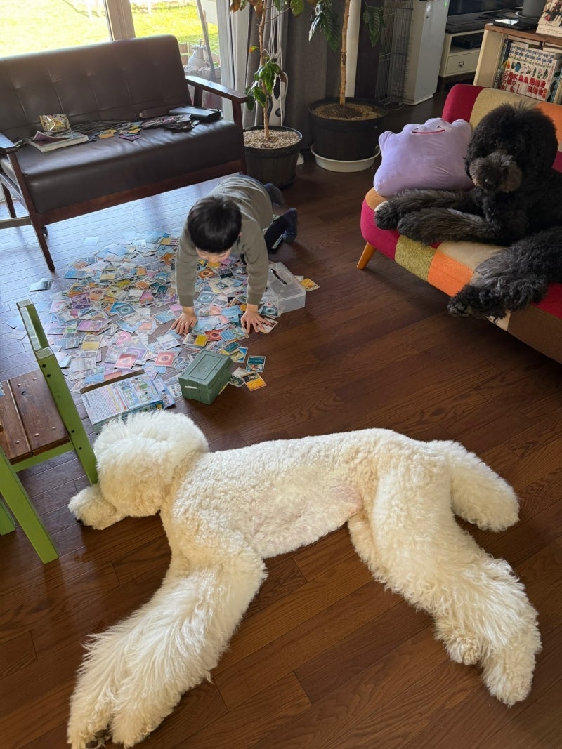 孫のカード整理を邪魔する愛犬
