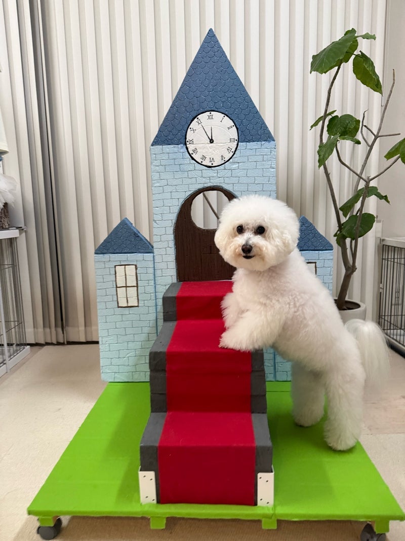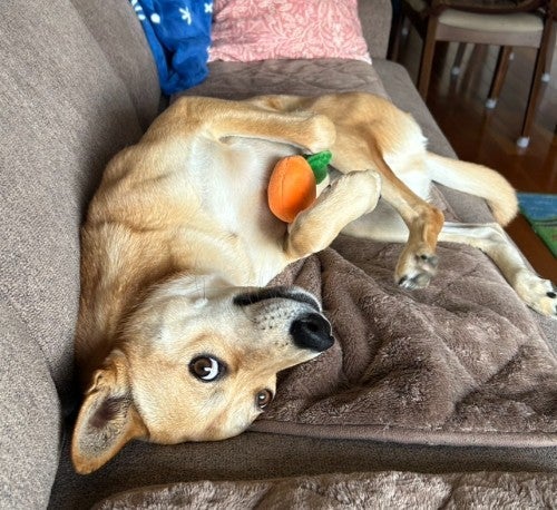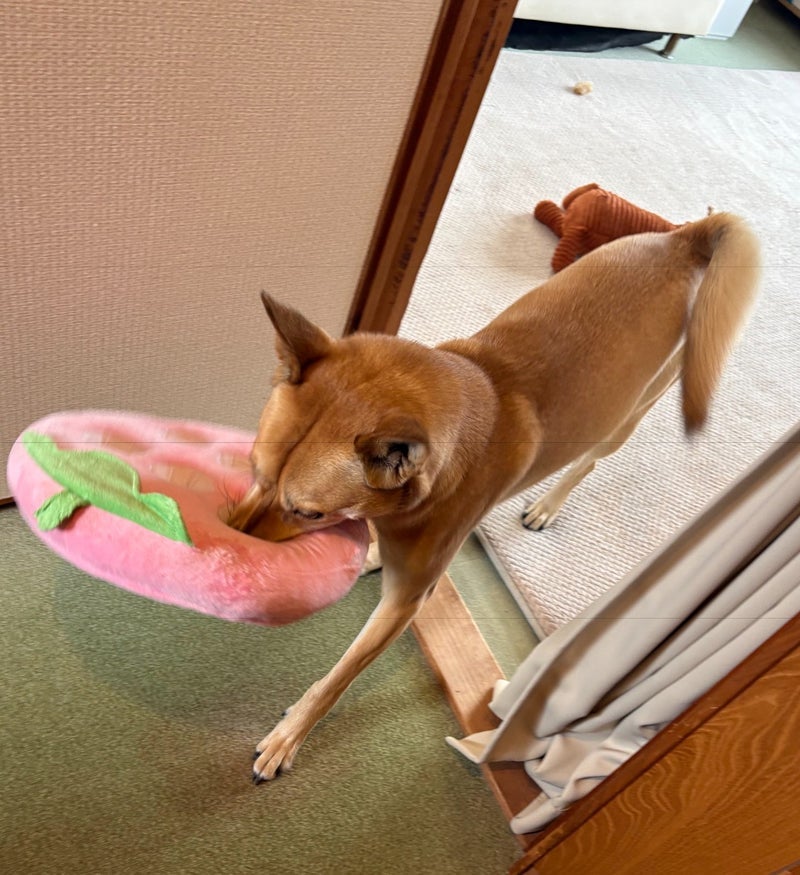 おもちゃをくわえ階段下りない愛犬