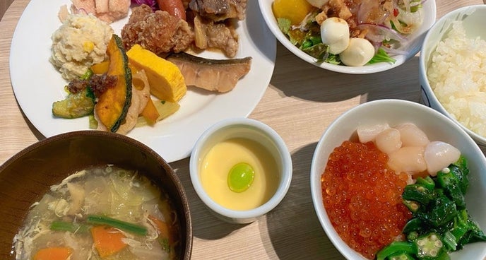 いくらとホタテで海鮮丼の朝食