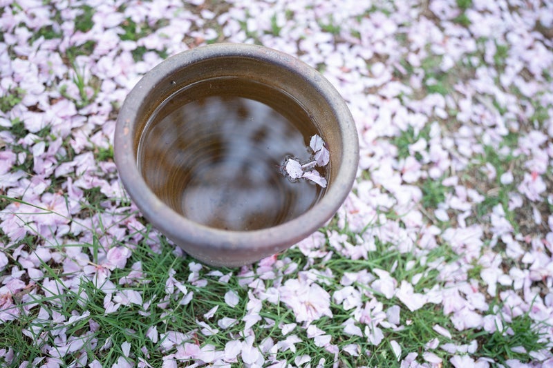 八重桜の花びらを受け止める水鉢
